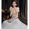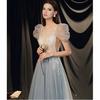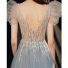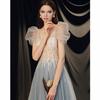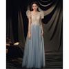The bodice is adorned with intricate embroidery and delicate beadwork that shimmer with every movement, adding a touch of sparkle that catches the light. The plunging V-neckline adds a daring yet elegant touch, perfectly balanced by the soft, puffed tulle sleeves that bring a romantic flair. The fitted bodice flows into a dreamy, A-line skirt made of layers of soft tulle in a serene dusty blue shade, reminiscent of a tranquil twilight sky. The tulle fabric is lightweight and airy, allowing you to move gracefully and comfortably throughout the evening.
