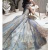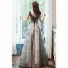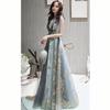 Step into your next event with confidence and elegance in this breathtaking evening gown, perfect for weddings, galas, or any special occasion where you want to make a memorable entrance. This luxurious dress features a dreamy shade of muted sky blue, adorned with delicate golden floral embroidery that cascades down the bodice and flows into the full, floor-length skirt. The intricate detailing is not only visually stunning but also adds a touch of opulence to your overall look, making you feel like the center of attention.