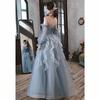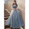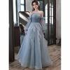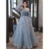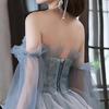 Made from high-quality materials, this gown features a mesmerizing shade of dusty blue that exudes elegance and grace. The off-shoulder design is complemented by sheer, billowing sleeves, adding a touch of ethereal beauty. The bodice is adorned with intricate beadwork, providing just the right amount of sparkle to catch the eye without being overpowering.