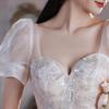 Step into a world of timeless elegance with our stunning gown, designed for the woman who desires to make a statement at any formal occasion. Whether you're attending a wedding, a grand ball, or an enchanting evening event, this exquisite dress ensures you will be the center of attention. The gown features a sweetheart neckline that beautifully accentuates your décolletage, while the delicate puff sleeves add a touch of romantic charm. Crafted with meticulous attention to detail, the bodice is adorned with intricate silver floral embroidery that gracefully flows into the soft, layered tulle skirt.