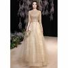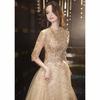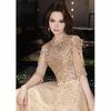 Step into the spotlight with this enchanting evening gown, perfect for weddings, galas, and special celebrations. This elegant dress radiates confidence and luxury, ensuring you feel like the belle of the ball. Crafted with meticulous attention to detail, the exquisite design features a shimmering gold hue that catches the light beautifully, creating a captivating effect.