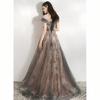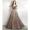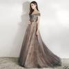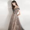 Crafted from high-quality materials, this gown features a captivating blend of delicate shades of smoky gray and rose gold, creating a mesmerizing ombrƩ effect. The off-shoulder neckline adds a touch of romantic allure, while the intricate floral appliquƩs shimmer as they catch the light, ensuring you will dazzle in any setting. The tailored bodice provides a flattering fit that accentuates your natural curves, giving you the confidence to shine all night long.