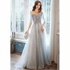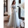 Step into elegance with this enchanting gown that’s perfect for formal evenings, weddings, and special celebrations. The dress features a sophisticated blend of silver-gray tulle and delicate lace, making it a timeless choice for those looking to leave a lasting impression. The soft, flowing tulle skirt creates a dreamy silhouette, while the intricately designed bodice adds a touch of sparkle that catches the light beautifully.