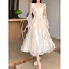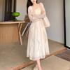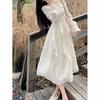 Step into elegance with this enchanting ivory chiffon midi dress, the perfect choice for any special occasion where you want to feel both graceful and confident. Whether you're attending a garden party, a romantic date, or a formal event, this dress ensures you stand out with its timeless beauty and sophisticated design. The dress features a flattering square neckline that frames your face beautifully, while the long, sheer puff sleeves add a touch of ethereal charm. The delicate ruffles cascading down the bodice and skirt create a whimsical and romantic silhouette that moves gracefully with every step.