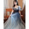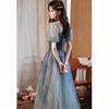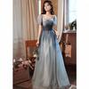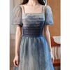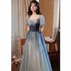 Step into timeless elegance with this enchanting gradient evening gown, perfect for formal events, weddings, or any occasion where you want to make an unforgettable impression. The delicate blend of soft blues and grays creates a serene and sophisticated look, reminiscent of a twilight sky. The square neckline and short puff sleeves add a touch of vintage charm, while the fitted bodice highlights your figure, giving you confidence as you glide through the night.