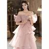 Crafted with the finest tulle fabric, this gown boasts a flowing, multi-layered skirt that adds an ethereal touch, making you feel like you’re floating on air. The soft ruffles cascading down the dress add volume and dimension, ensuring a truly regal silhouette. The off-shoulder design with flutter sleeves not only offers a romantic and timeless look but also provides a comfortable fit, perfect for dancing the night away.