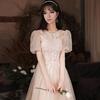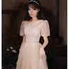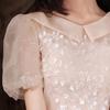 Crafted with meticulous attention to detail, this gown boasts a stunning sequin-embellished bodice that glistens with every movement, capturing the light beautifully. The soft, airy tulle overlay adds a whimsical touch, creating a romantic and ethereal silhouette. The puff sleeves and Peter Pan collar enhance the dress's charming, vintage-inspired aesthetic.