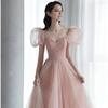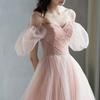 Crafted with meticulous attention to detail, this gown features delicate puffed sleeves that offer a whimsical charm, complementing the fitted bodice that accentuates your natural curves. The sweetheart neckline adds a romantic touch, making this dress ideal for those special moments where you want to feel your most beautiful. The multi-layered tulle skirt cascades elegantly to the floor, giving you that ethereal, floating-on-air sensation as you move.